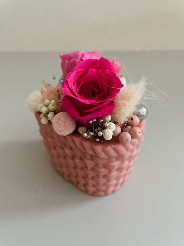 ほんのりアロマの香りのフラワーバスケット 置いておくだけでほんのり香ります (ディフューザーのように強く香るものではないので小さなお子さまやペットがいるお家でも安心してご利用いただけます 【フラワーバスケット】 ローズをメインにプリザーブドフラワー・ドライフラワーをたくさんいれました ほんのりプルメリアの香り 材料 ソイワックス・ミツロウワックス使用 ミツロウは空気を浄化するといわれています ※天然の花やワックスを使用していますので、直射日光の当たるところ、または気温が高い所に長時間置かないでください ※あくまでハンドメイドですので、多少の綻びはご理解の上、お願いします
